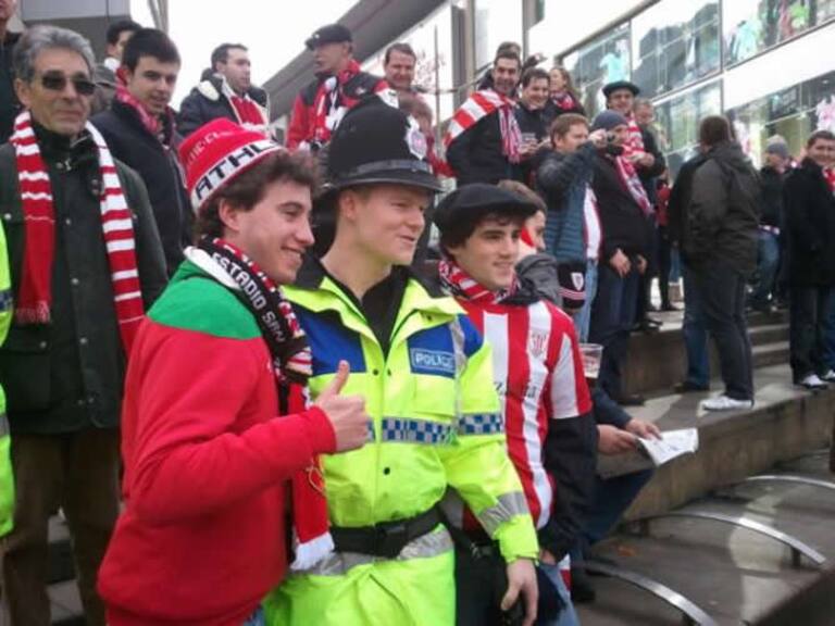 Fotografía de los bilbaínos con un policía en Manchester