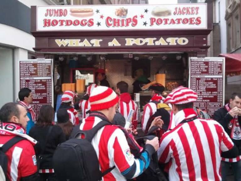 Todos los desplazados a Old Trafford comiendo antes del partido
