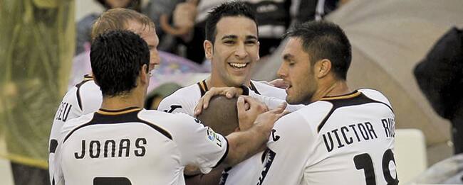 Los jugadores valencianistas se abrazan tras el primer gol de Feghouli(EFE)