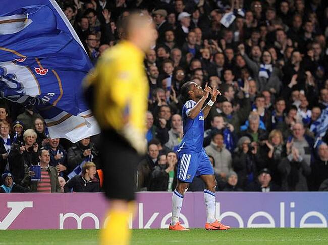 Drogba celebra su gol al filo del descanso ante la presencia de Víctor Valdes