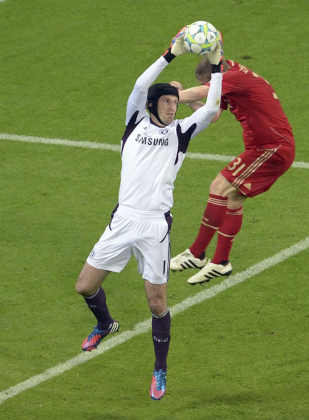 Bastian Schweinsteiger trata de marcar ante el portero checo Petr Cech
