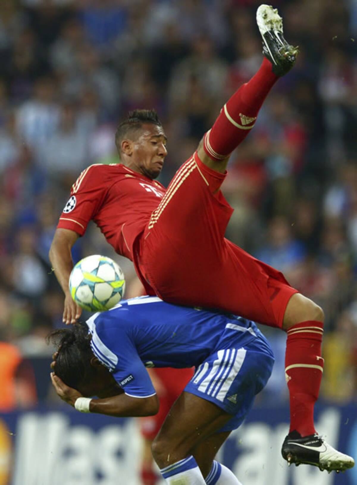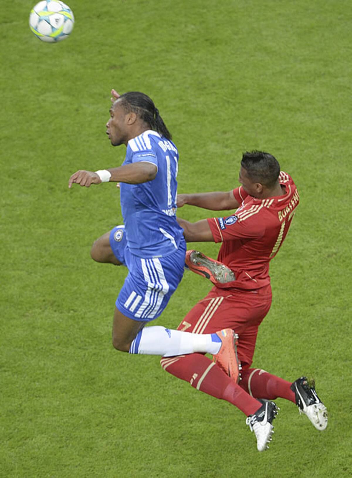 Jerome Boateng y el jugador del Chelsea Didier Drogba luchan por un balón