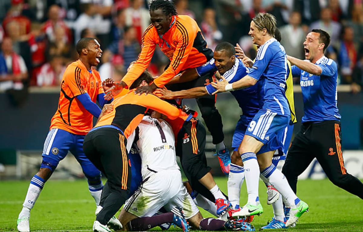 Los jugadores del Chelsea se abrazan a Drogba después de marcar el penalti que da la Champions al Chelsea