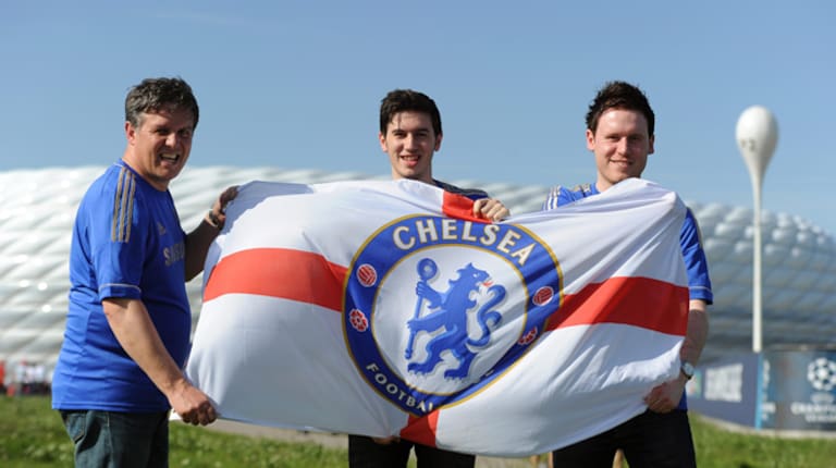 Unos hinchas del Chelsea posan ante el estadio Allianz Arena de Múnich, Alemania, el sábado 19 de mayo de 2012. Hoy se disputa en este estadio la final de la Liga de Campeones entre el Bayern de Múnich y el Chelsea