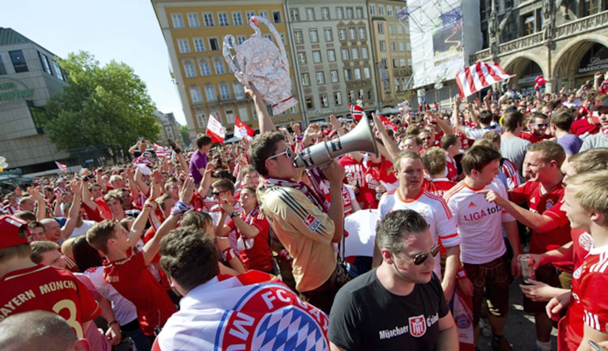 Aficionados del Bayern de Múnich se reúnen en la Marienplatz en Múnich, Alemania, el sábado 19 de mayo de 2012. Hoy se disputa en el estadio Allianz Arena de la capital bávara la final de la Liga de Campeones entre el Bayern de Múnich y el Chelsea