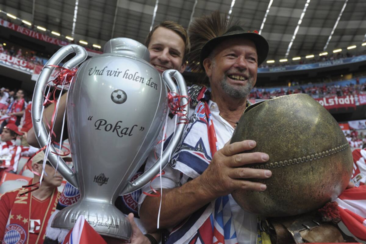 Unos hinchas del Bayern de Múnich animan a su equipo en el estadio Allianz Arena de Múnich, Alemania, hoy, sábado 19 de mayo de 2012, antes de la final de la Liga de Campeones entre el Bayern de Múnich y el Chelsea