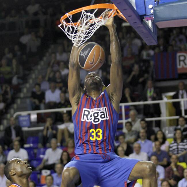 El alero estadounidense del Regal Barcelona, Pete Mickeal, machaca la canasta ante el francés Florent Pietrus, del Valencia Basquet, durante el primer partido de las semifinales de la Liga ACB disputado esta noche en el Palau Blaugrana, en Barcelona(EFE)