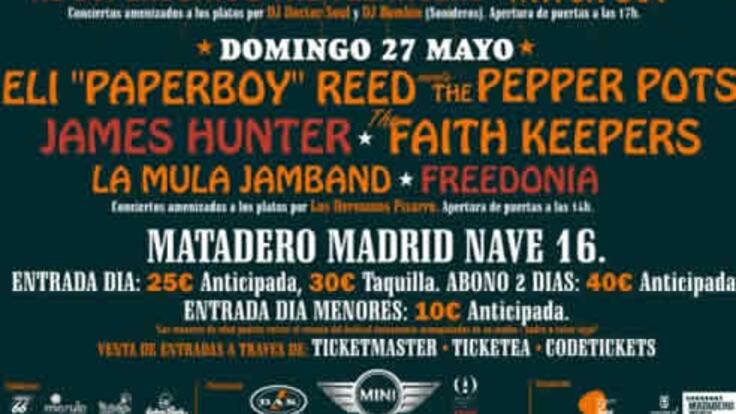El Matadero de Madrid será el escenario perfecto para un festival que nace con una finalidad terapéutica y curativa. Por Madrid pasarán clásicos del soul como The Impressions, mítica formación de Chicago que actuará por primera vez en España, pero también nuevos talentos y bandas por descubrir. Entre los grupos que tomarán este fin de semana Madrid destacan las actuaciones de dos nombres fuertes en el regreso de este género, el británico James Hunter y el estadounidense Eli Paperboy Reed. Hunter representa el soul más clásico y baladista marcado por las perfectas interpretaciones de este excelente vocalista que ha sido calificado por Van Morrison como el secreto mejor guardado de Inglaterra. Eli Paperboy Reed viene a defender un soul más visceral, más salvaje, de gritos desgarradores que provienen de lo profundo del alma de un chico blanco que bien podría haber sido una estrella en la época de Motown. El estadounidense actuará en dos ocasiones, junto a la banda catalana The Pepper Potts y en un pase dedicado a los niños pequeños que acudan al festival. También se espera mucho del concierto Lisa Kekaula, (cantante de Bell Rays) que viene acompañada de una banda formada por miembros de los True Loves (banda habitual de Paperboy) y de The Solution.