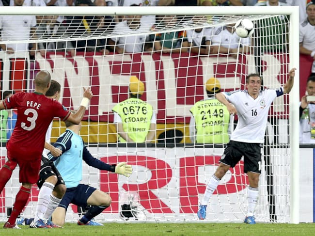 El jugador de la selección portuguesa Pepe dispara al larguero ante la presencia del internacional alemán Philipp Lahm durante el partido de la Eurocopa 2012 correspondiente al Grupo B entre las selecciones de Portugal y Alemania, en Lviv, Ucrania, el sáb(EFE)
