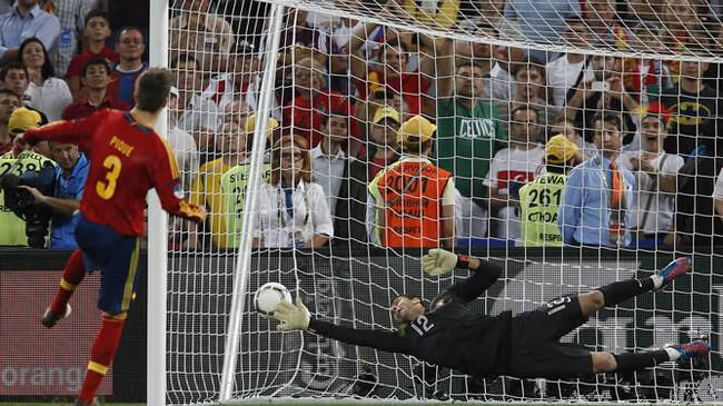 El jugador de España Gerard Piqué (i) anota un gol de penalti en la ronda de tiros ante Portugal, miércoles 27 de junio de 2012, en la semifinal de la Eurocopa 2012 en Donetsk (Ucrania). España ganó y es finalista del torneo(CADENA SER)