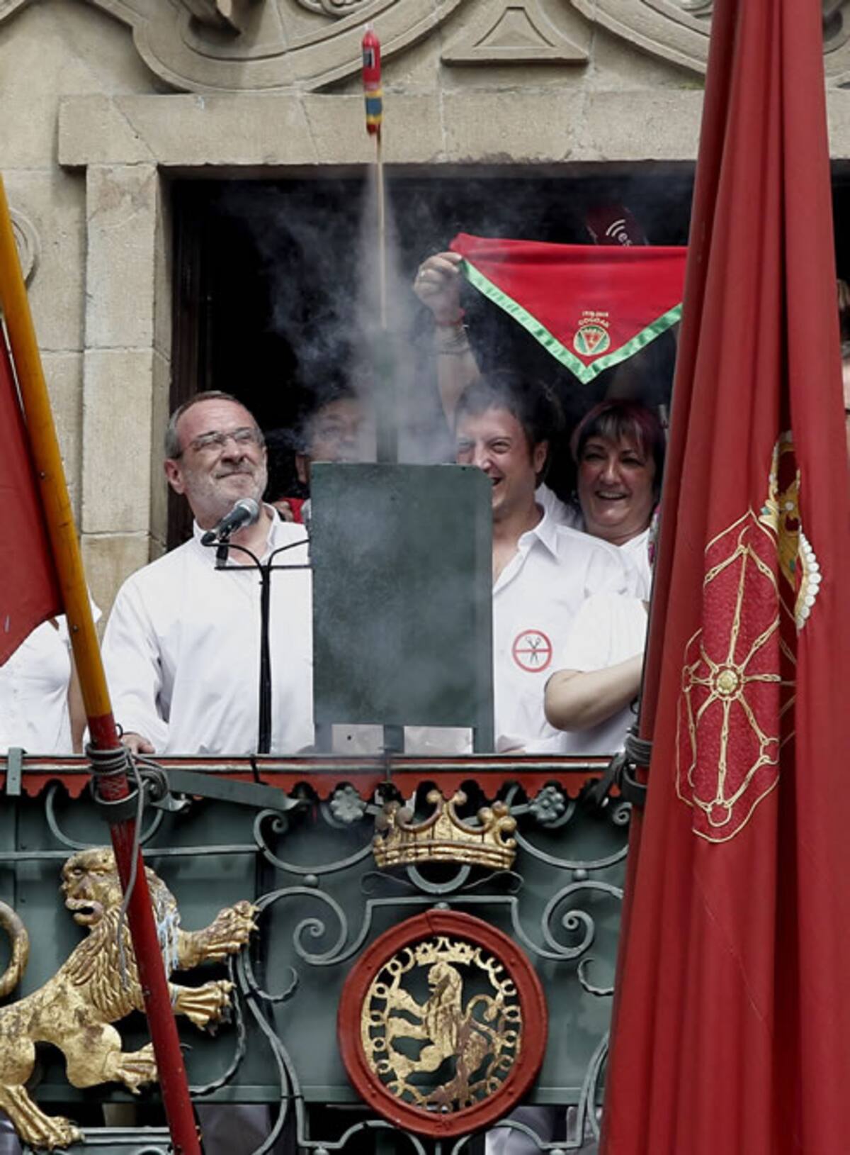 El concejal de Nafarroa Bai Iñaki Cabases prende desde el balcón del Ayuntamiento de Pamplona la mecha del cohete anunciador de las fiestas