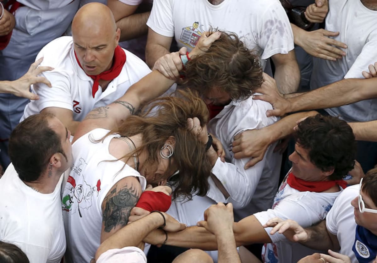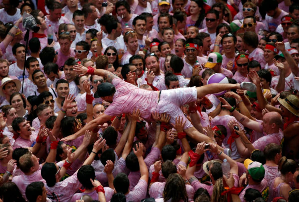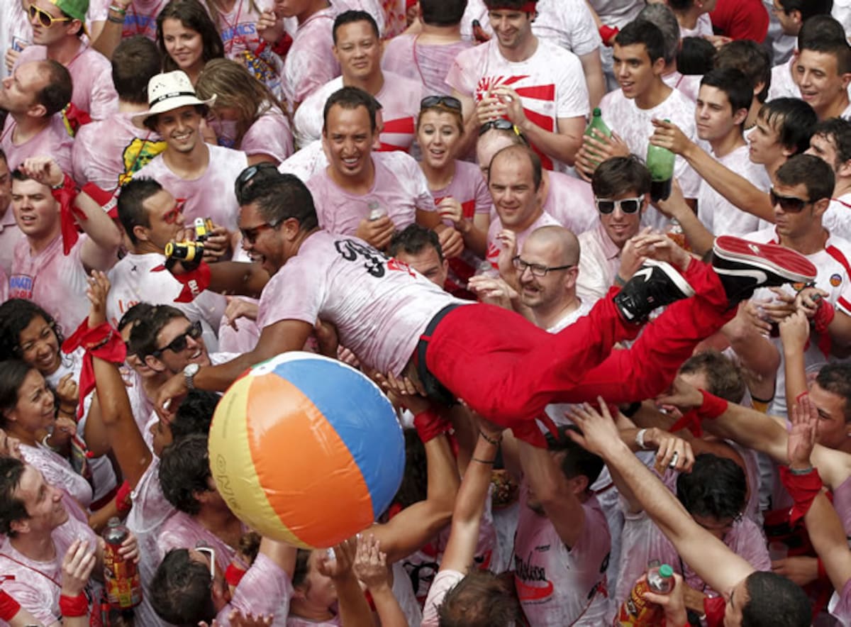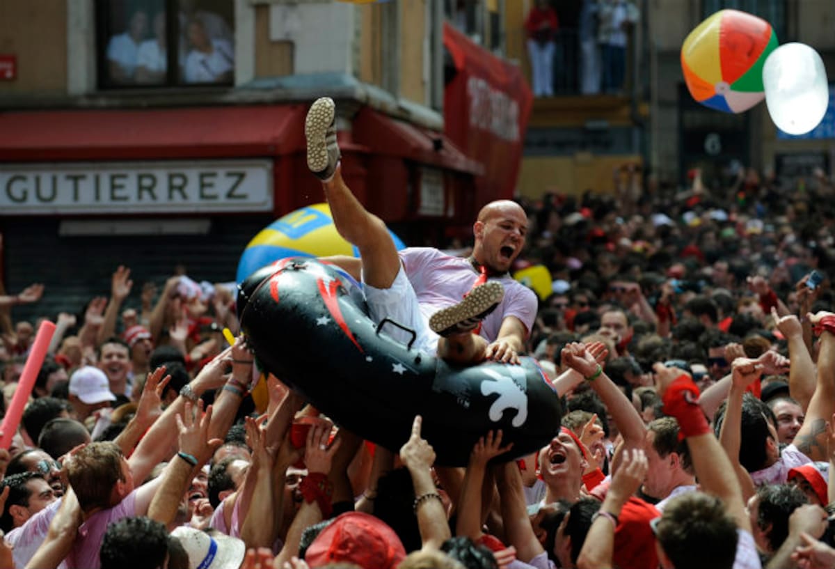 Un asistente se deja llevar en el aire por la multitud durante el inicio San Fermín 2012 en Pamplona