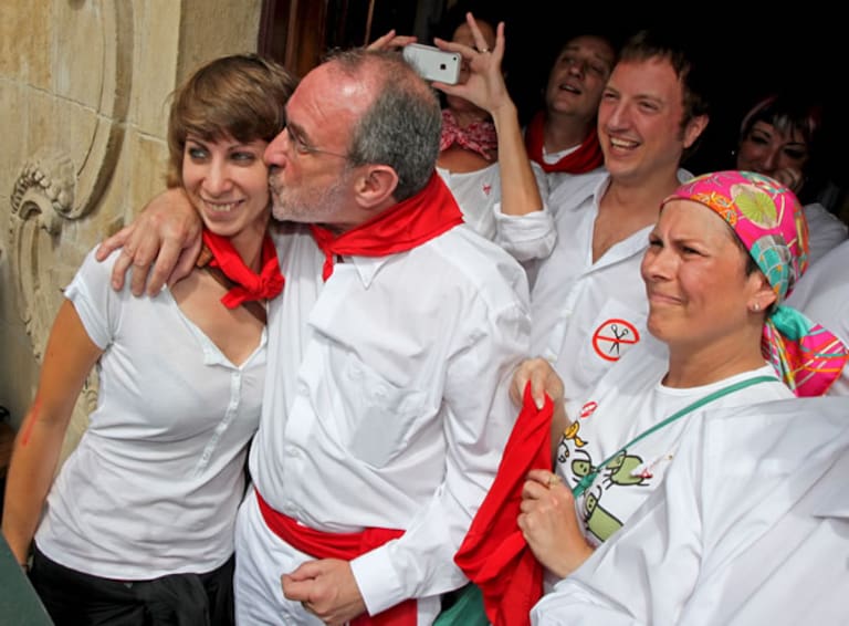 El concejal de Nafarroa Bai Iñaki Cabases besa a un familiar junto a la diputada de Geroa Bai, Uxue Barkos , tras prender la mecha del cohete anunciador de la fiestas