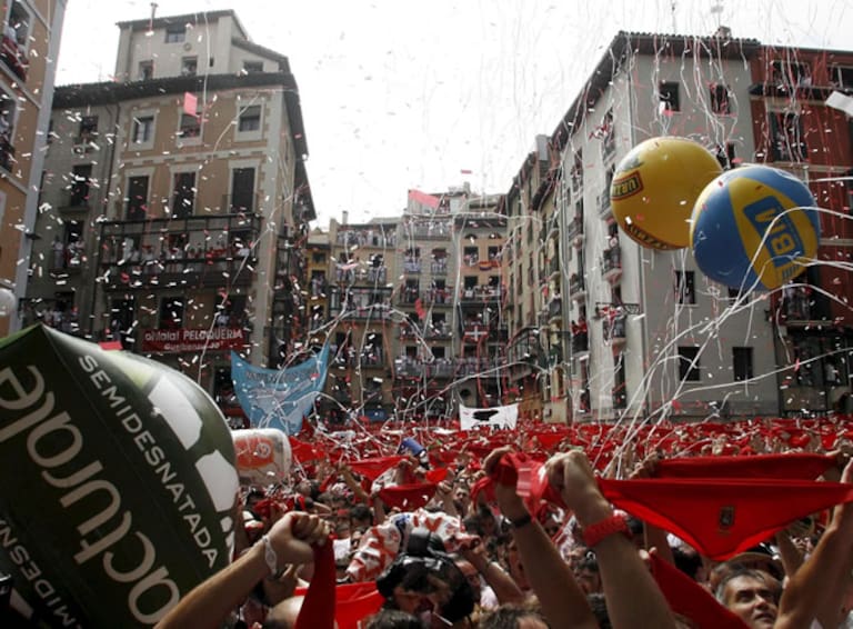 La Plaza del Ayuntamiento de Pamplona, llena de gente celebrando le inicio de las fiestas de San Fermín