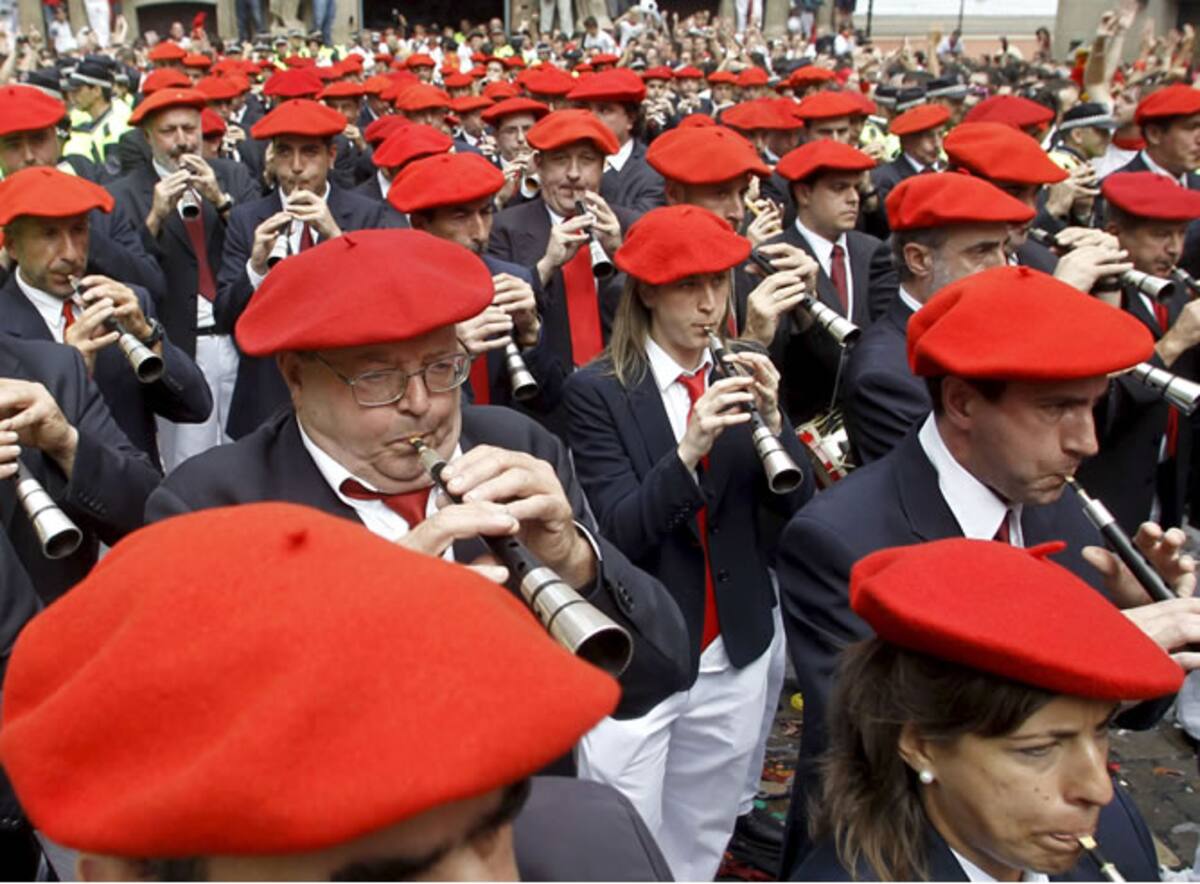 Una banda de gaiteros toca los primeros acordes en la Plaza del Ayuntamiento de Pamplona tras el inicio de los sanfermines