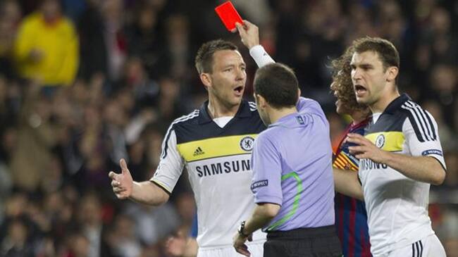 El defensa del Chelsea John Terry ve la tarjeta roja tras agredir al jugador del Barcelona Aléxis Sánchez(EFE)