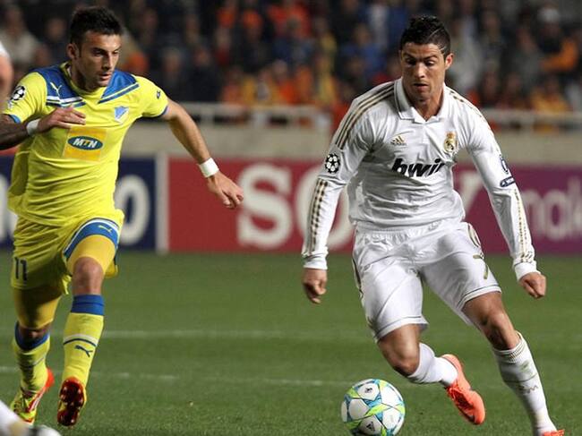 El delantero portugués del Real Madrid Cristiano Ronaldo lucha por el control del balón con Ivan Trickovski del APOEL FC durante el partido de ida de cuartos de final de Liga de Campeones(EFE)