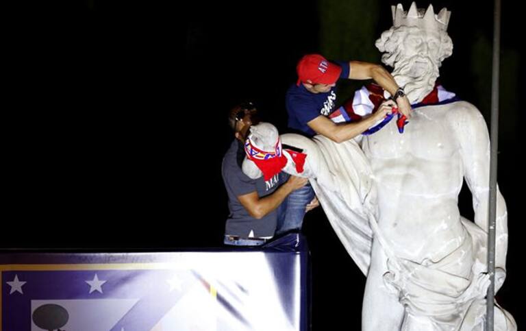 El capitán del Atlético de Madrid Gabi le coloca una bandera rojiblanca a Neptuno durante los actos de celebración de la Supercopa de Europa