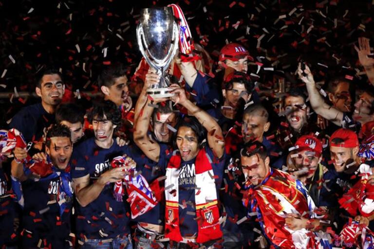 El delantero colombiano del Atlético de Madrid Radamel Falcao celebra junto a sus compañeros el triunfo en la Supercopa de Europa