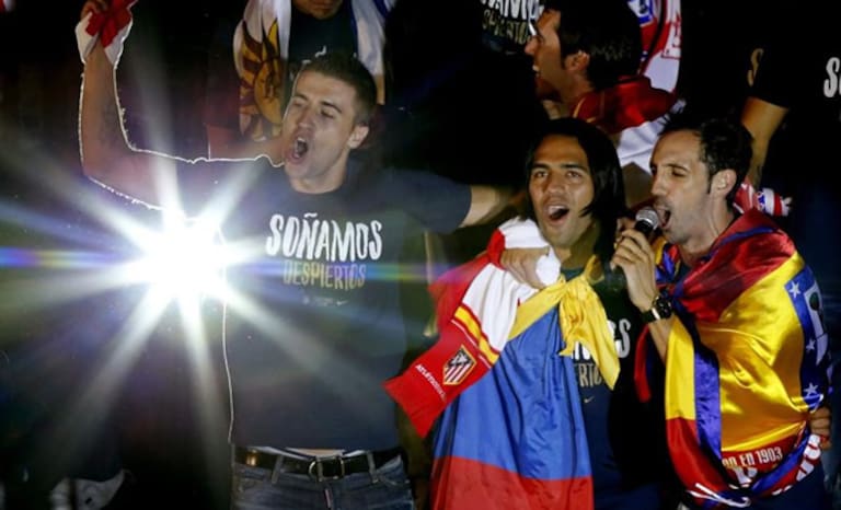 El colombiano celebra con sus compañeros en Neptuno la consecución de la Supercopa por parte del Atlético ante el Chelsea