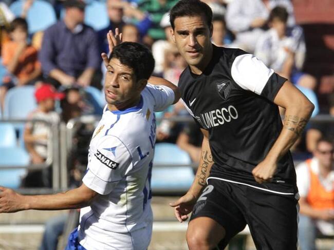 El centrocampista argentino del Real Zaragoza, Lucas Wilchez (i), intenta robar la pelota al defensa del Málaga CF, Jesús Gámez, durante el partido correspondiente a la tercera jornada de la Liga de Primera División(Agencias)