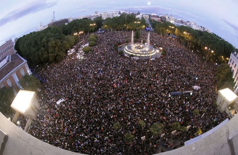 Vista de la plaza de Neptuno de Madrid donde gran número de personas se han congregado esta tarde, convocados por la Coordinadora 25S dentro de la iniciativa "Rodea el Congreso
