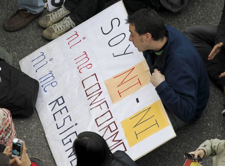 Un manifestante se sienta con una pancarta en la madrileña plaza de Neptuno