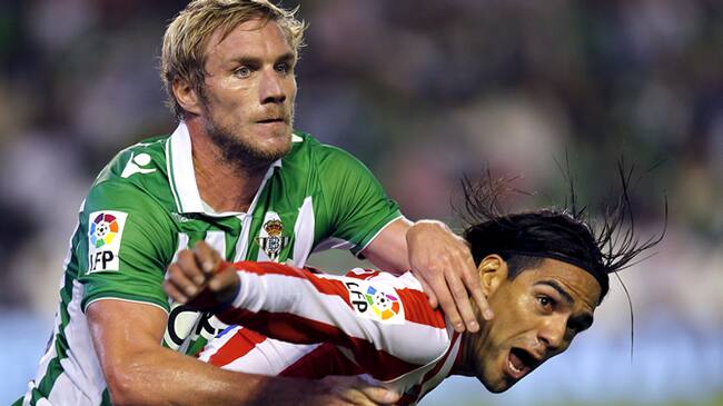 El defensa francés del Real Betis, Damien Perquis, pelea con el delantero colombiano del At. de Madrid, Radamel Falcao.