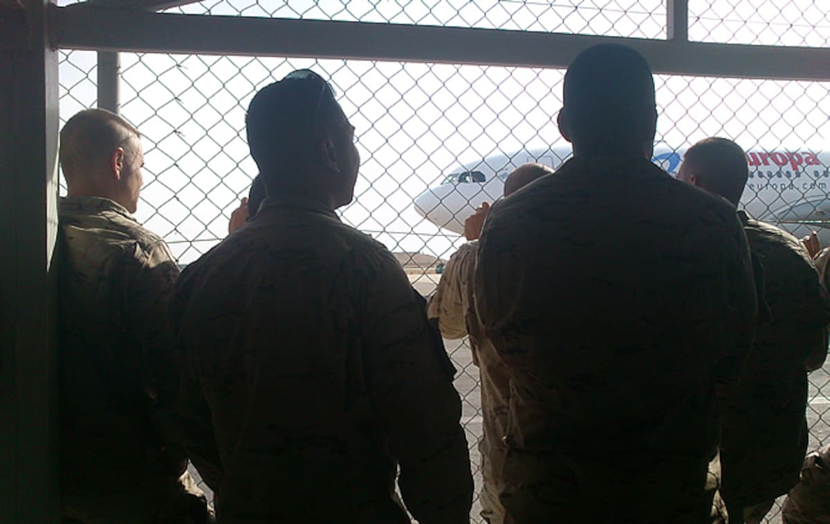 Dos soldados esperan el avión que les traerá de vuelta a casa
