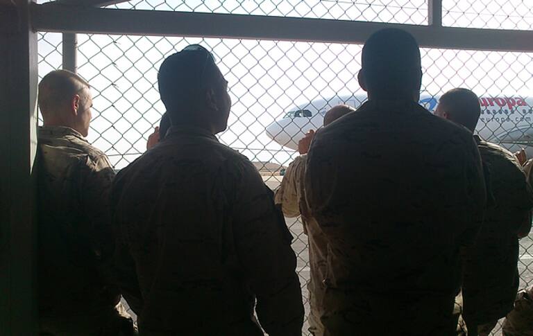 Los soldados esperan tras la verja. Los mandos abrirán la puerta cuando aterrice el avión para evitar que la emoción les haga invadir la pista de aterrizaje