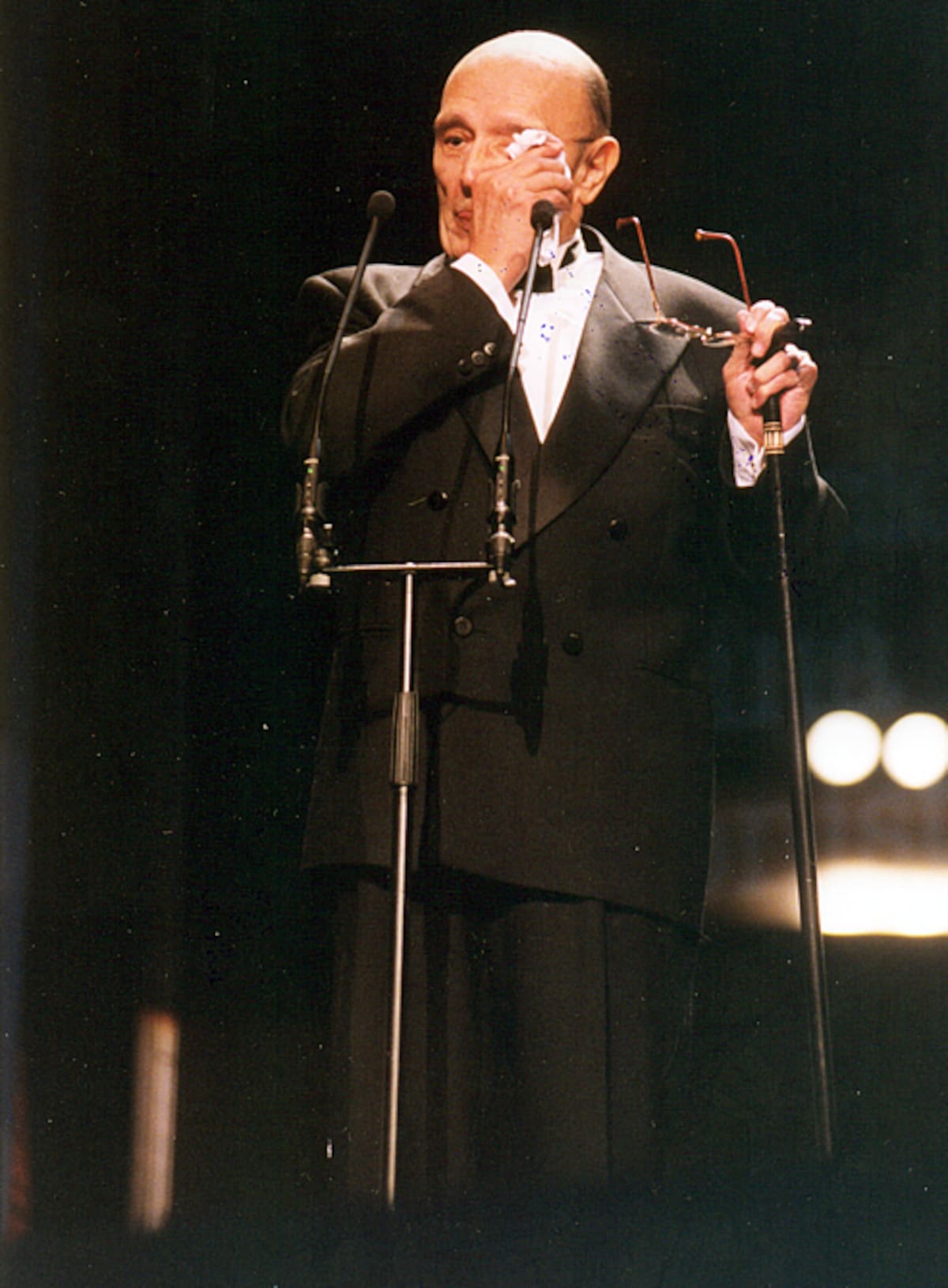 Años después de conseguir el Goya de Honor, Tony Leblanc llora en el escenario tras recibir el Goya al Mejor Actor de reparto por su papel en 'Torrente, el brazo tonto de la ley'