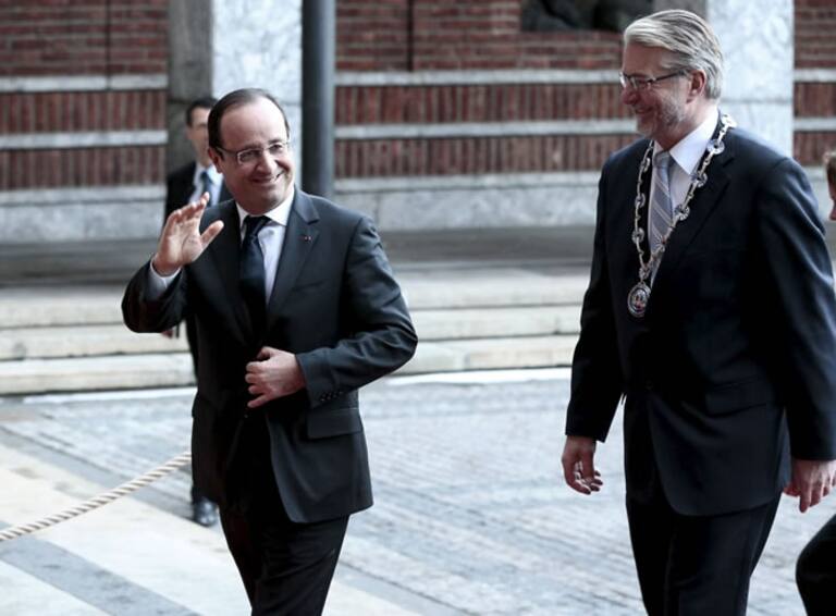 El presidente francés, Hollande, es recibido por el alcalde de Oslo Stang antes d ela entrega del Nobel de la Paz