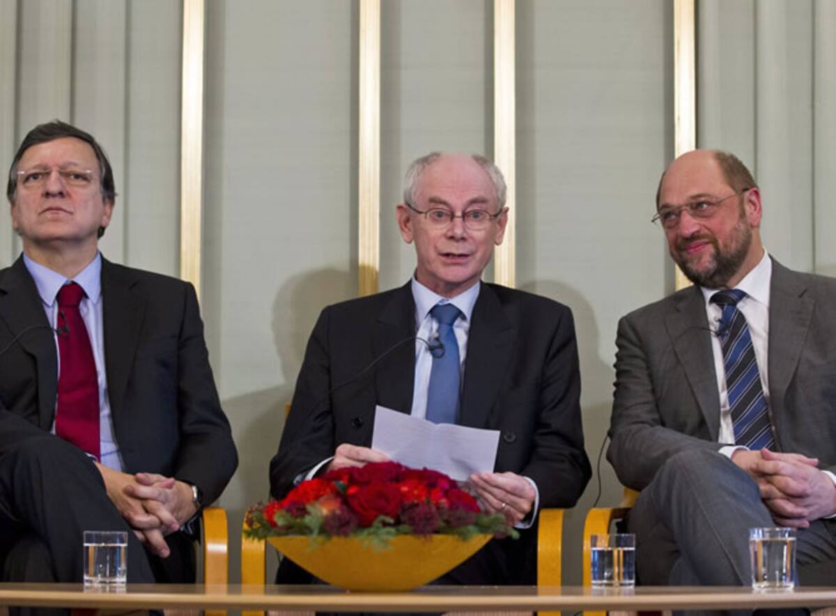 El presidente de la Comisión Europea, José Manuel Barroso, el presidente del Consejo Europeo, Herman Van Rompuy, y el presidente del Parlamento Europeo, Martin Schulz, en una conferencia de prensa en el Instituto Nobel
