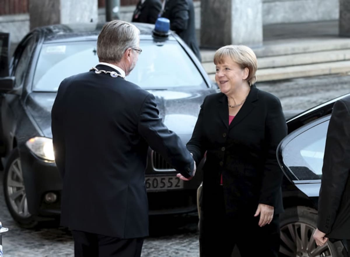 La canciller alemana, Angela Merkel, es recibida por el alcalde de Oslo antes de la ceremonia del Premio Nobel de la Paz