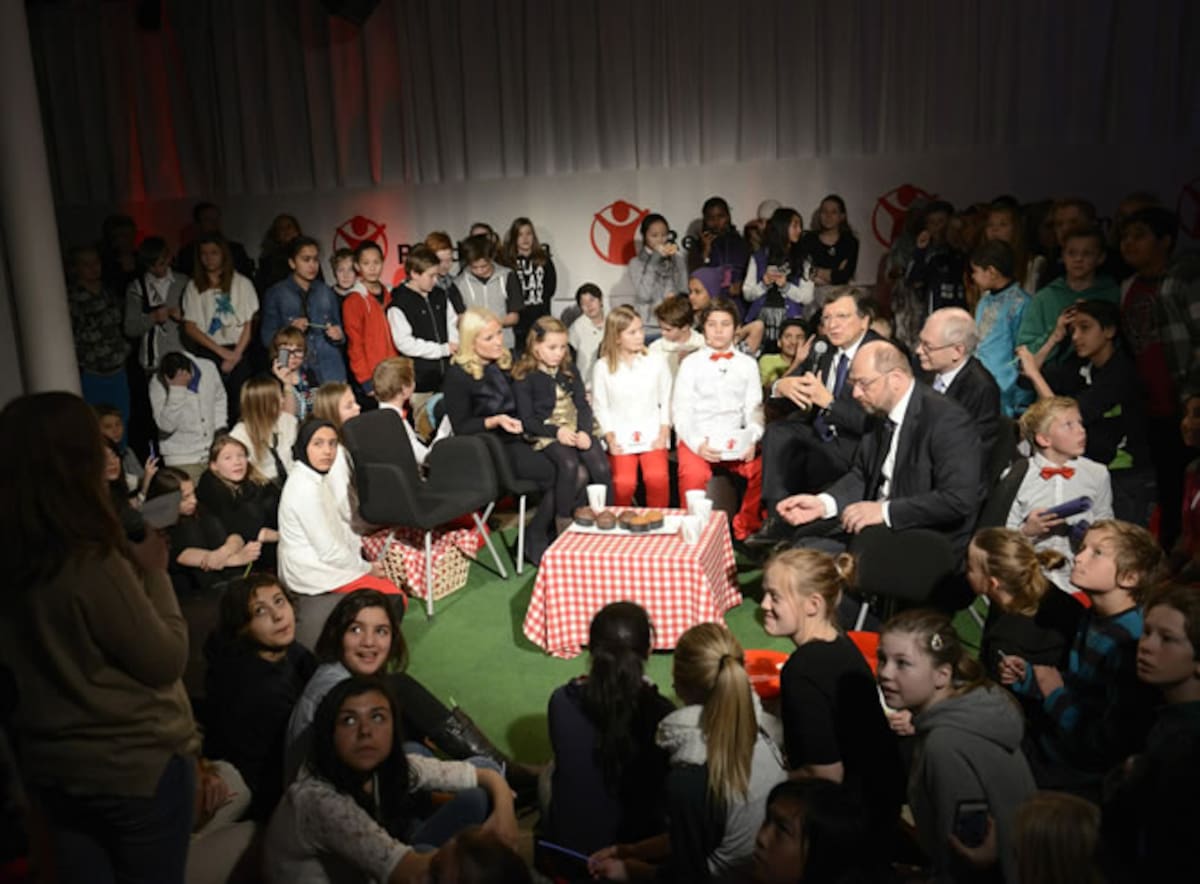 El presidente del Consejo Europeo, Rompuy, el presidente del Parlamento Europeo, Schulz, y el presidente de la Comisión, Barroso, en un encuentro con la Corona Noruega, la princesa Mette-Marit, la Princesa Ingrid Alexandra y otros niños en un acto en el C