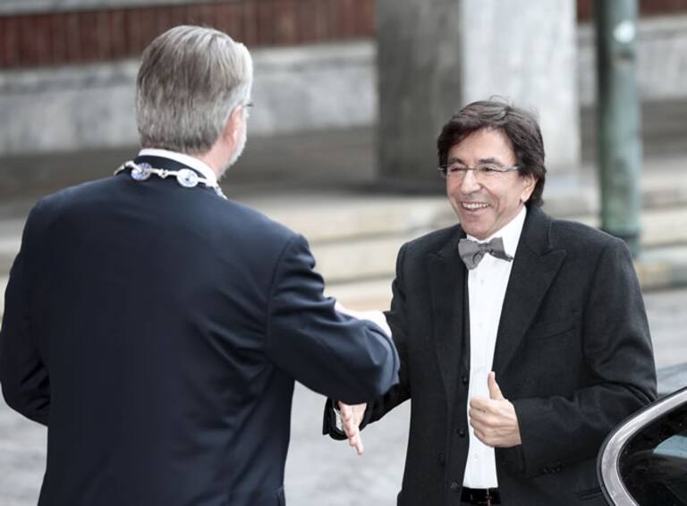 El primer ministro belga, Elio Di Rupo, es recibido por el alcalde de Oslo, Fabian Stang, a las afueras del ayuntamiento, antes de la ceremonia del Premio Nobel de la Paz, en Oslo