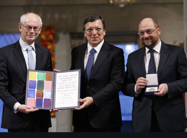 José Manuel Barroso, Martin Schulz, Herman Van Rompuy posan con el galardón del Premio Nobel de la Paz