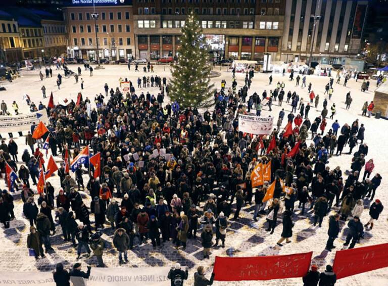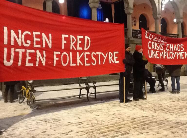 Un grupo de activistas con pancartas protestan en Oslo por la concesión del Nobel de la Paz a la unión Europea