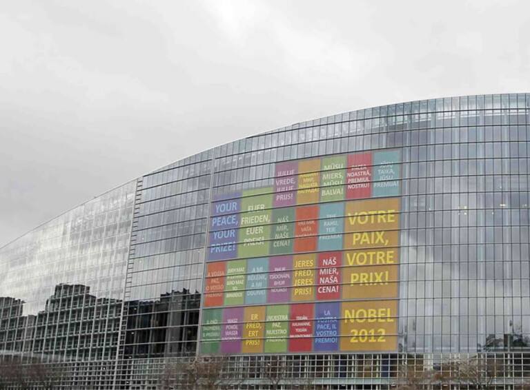 El edificio del Parlamento Europeo se ve adornado con el lema "Su paz, Su premio Nobel 2012", escrito en las lenguas de países miembros de la UE