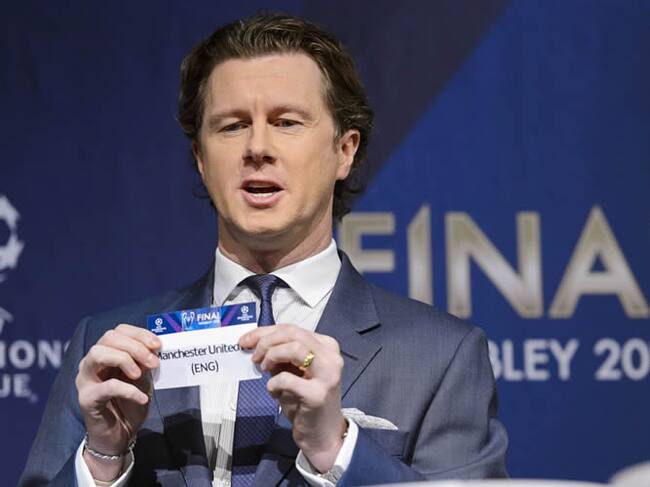 El embajador de la final de la Liga Campeones y exfutbolista Steve McManaman muestra la papeleta con el nombre del Manchester United durante el sorteo de los octavos de final de la Liga de Campeones celebrado en la sede de la UEFA en Nyon, Suiza, este jue