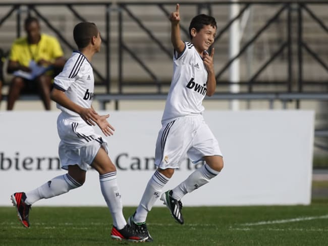 Los jugadores del equipo alevín del Madrid celbrando un gol en el Torneo Internacional de Arona, organizado por la Fundación de 'El Larguero'(AS.COM)