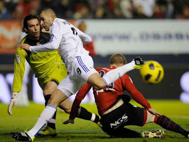 Benzema lucha por el balón ante el portero del Osasuna durante el partido de la 21ª jornada de la Liga BBVA(Reuters)