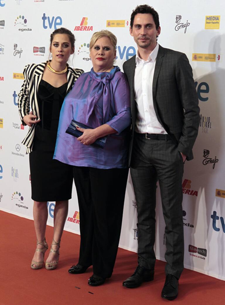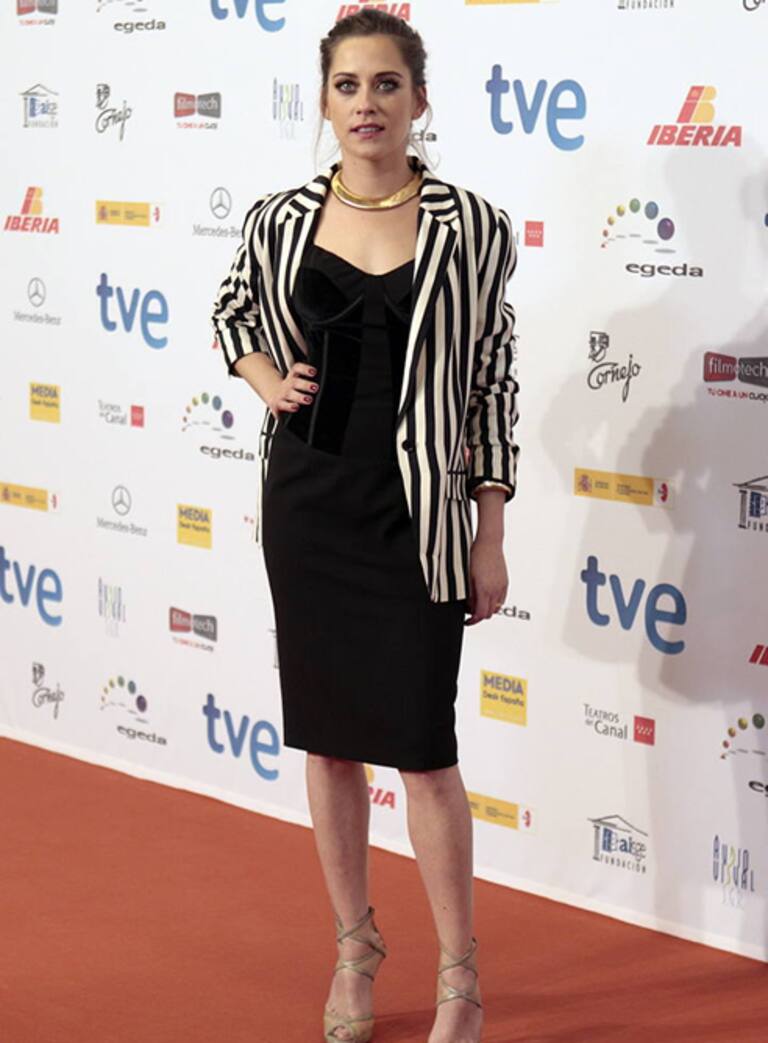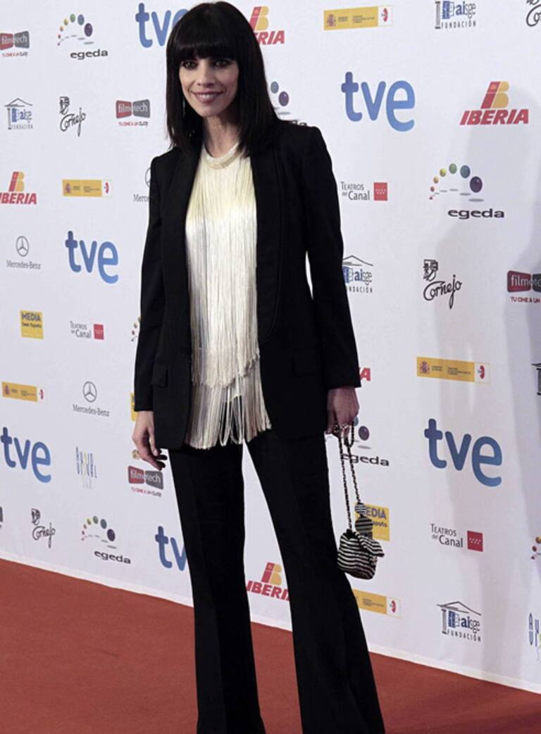 • Maribel Verdú con traje de chaqueta negro y blusa blanca con flecos