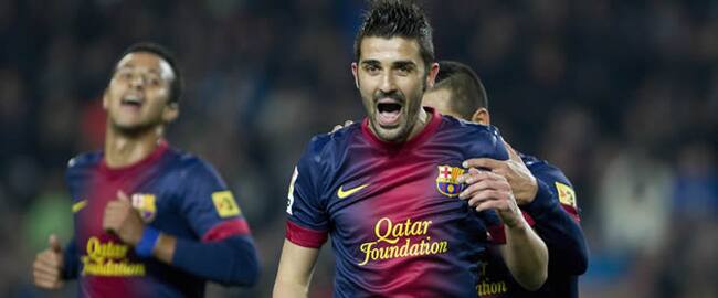 El delantero del Barcelona David Villa celebra su segundo gol, el tercero de su equipo en el partido ante el Córdoba, correspondiente al encuentro de vuelta de octavos de final de la Copa del Rey, disputado esta noche en el Camp Nou(EFE)