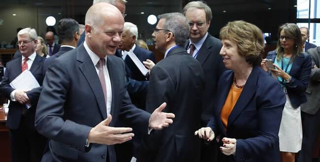 El ministro de Asuntos Exteriores británico, William Hague (izq), conversa con la jefa de la diplomacia europea, Catherine Ashton (dcha), antes de una reunión de urgencia de los ministros de Exteriores de la Unión Europea(REUTERS/Francois Lenoir)