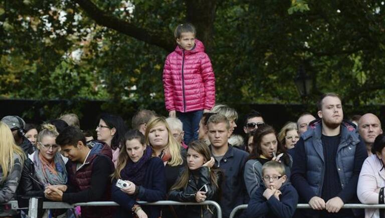 Un grupo de personas espera la llegada de los duques de Cambridge a la entrada del Palacio de St. James, con el motivo del bautizo del príncipe Jorge, en Londres.