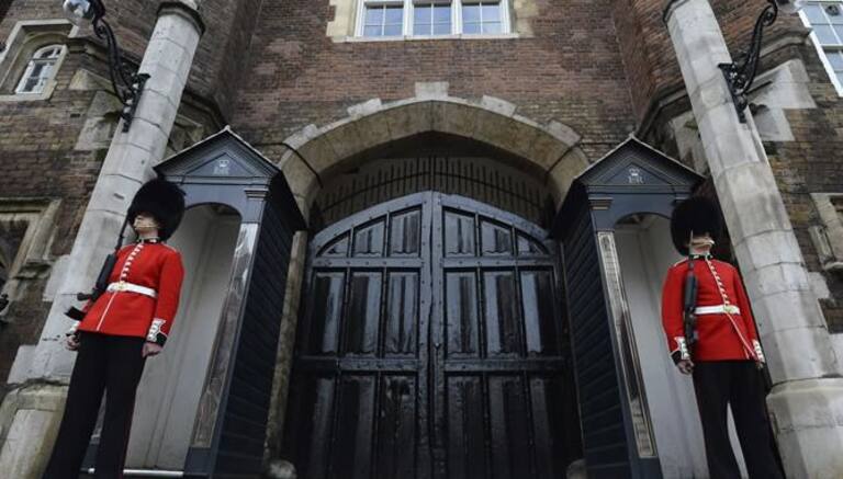 Dos guardias custodian la entrada del palacio de St.James's antes del bautizo del príncipe Jorge, hijo de los duques de Cambridge, en Londres (Reino Unido) hoy, miércoles 23 de octubre de 2013.