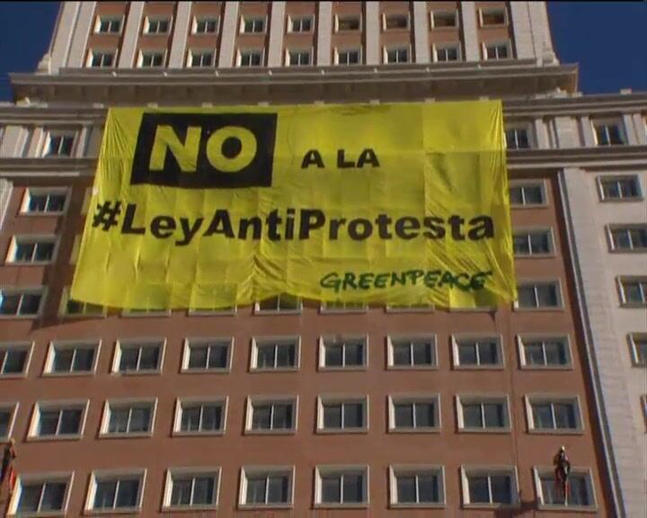 Greenpeace protesta contra la nueva 'Ley de Seguridad Ciudadana' con una pancarta gigante