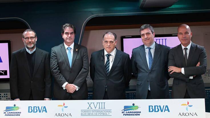 José Ramón de la Morena ha presentado el torneo junto a Manu Carreño, Miguel Cardenal, secretario de Estado para el Deporte; Javier Tebas, presidente de la Liga de Fútbol Profesional; Francisco Miño, alcalde de Arona; Carlos Ricardo, de BBVA, y Álex Martínez, de Canal +. / CADENA SER