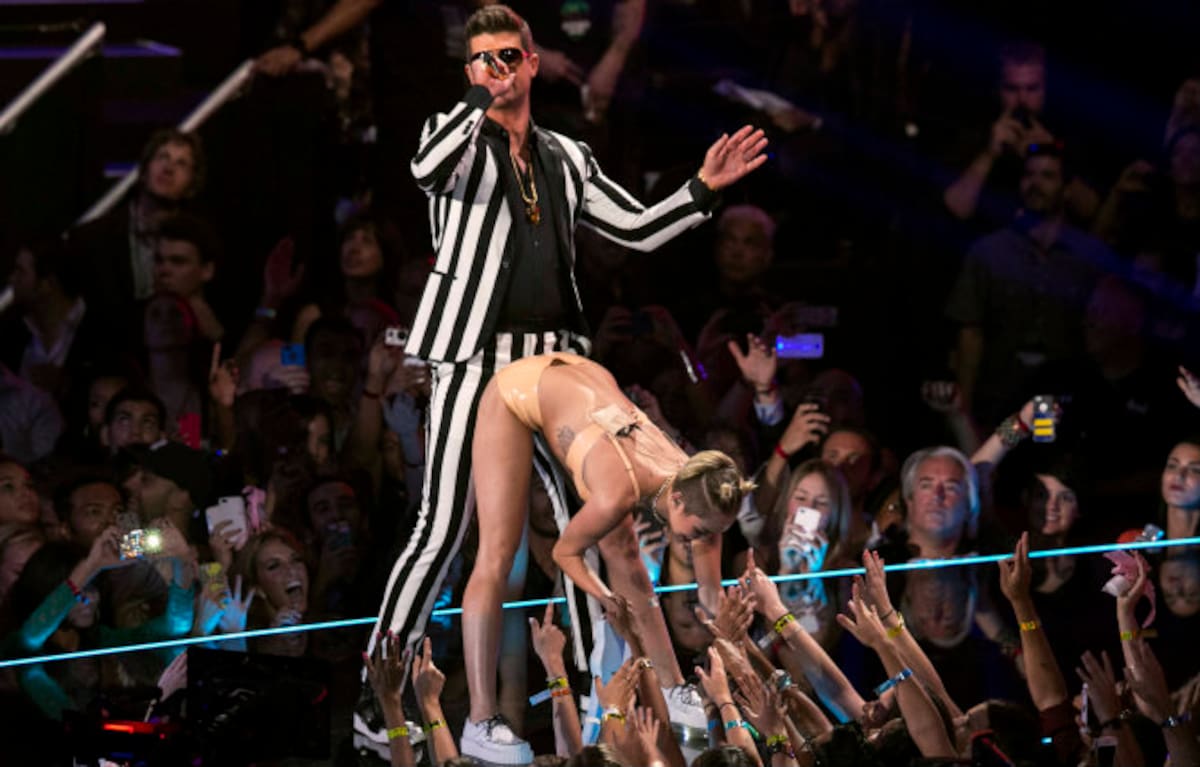 Miley Cyrus junto a Blurred Lines bailando durante su polémica actuación en la gala de los MTV 2013